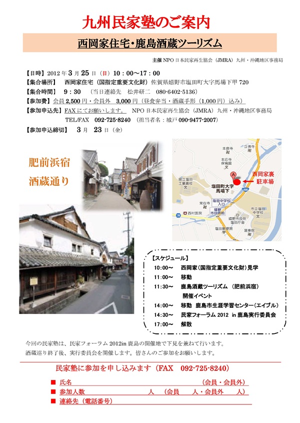 今秋開催する「民家フォーラム2012」を開催する鹿島で、下見を兼ね民家塾を開催です。ご参加お待ちしています。